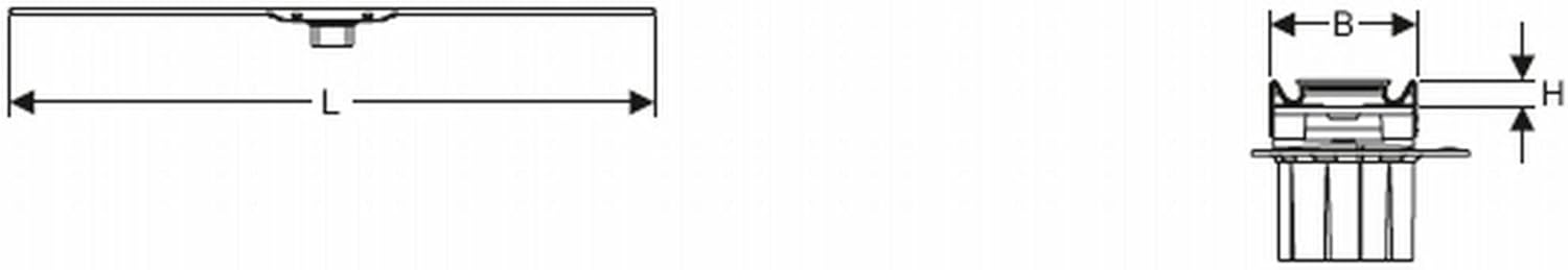 Aworan yii pese alaye kan view of the shower channel's internal structure and key dimensions (L, B, H), which are critical for planning the installation. It shows how the grille integrates with the channel body and the underlying drainage system.