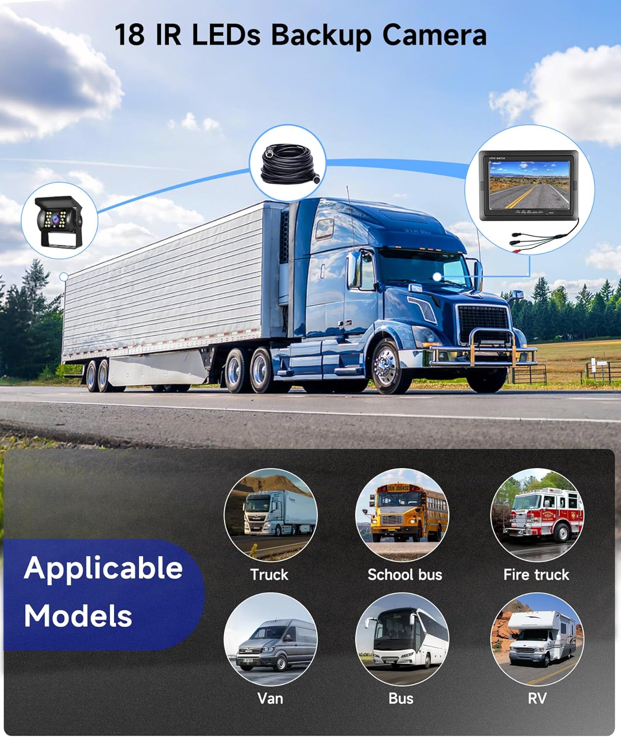 Figure 1: Applicable Vehicle Models. The system is suitable for a wide range of vehicles including trucks, school buses, fire trucks, vans, buses, and RVs.
