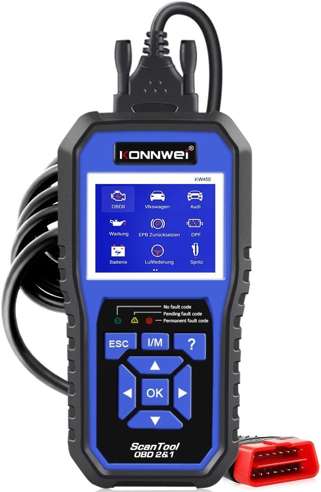 The KONNWEI KW450 is a comprehensive OBD2 diagnostic scanner designed for both VAG group vehicles (Volkswagen, Audi, Seat, Skoda) and universal OBDII/EOBD compliant cars. This advanced, user-friendly tool enables technicians and car owners to accurately diagnose and perform maintenance functions on various vehicle systems. It supports a wide range of special functions for VAG vehicles and standard OBDII diagnostic capabilities for all compatible cars.