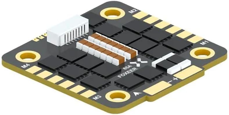 Figure 1: CUIPPWRJ Reaper F4 128K 65A BLHeli32 4-in-1 ESC. This image displays the CUIPPWRJ Reaper F4 128K 65A BLHeli32 4-in-1 Electronic Speed Controller. It features a compact, square design with gold-plated pads for motor connections (M1, M2, M3, M4) and main power input (+/-). Key components like capacitors and the main processor are visible, along with the '65A FOXEER' branding, indicating its current rating and a potential component supplier or design influence. A white connector for signal input is also present.