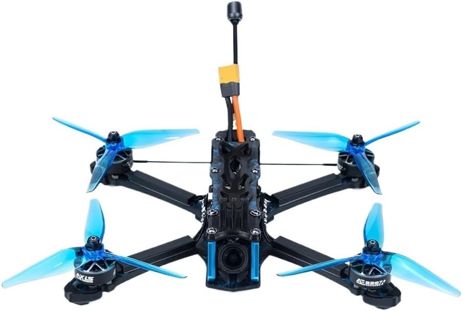 Nọmba 1: The CUIPPWRJ Manta5 SE Drone, featuring its Squashed-X frame, AE227-1960KV motors, and translucent blue propellers. The FPV camera is visible at the front, and the antenna and battery connector are at the top. This image illustrates the fully assembled drone ready for flight.