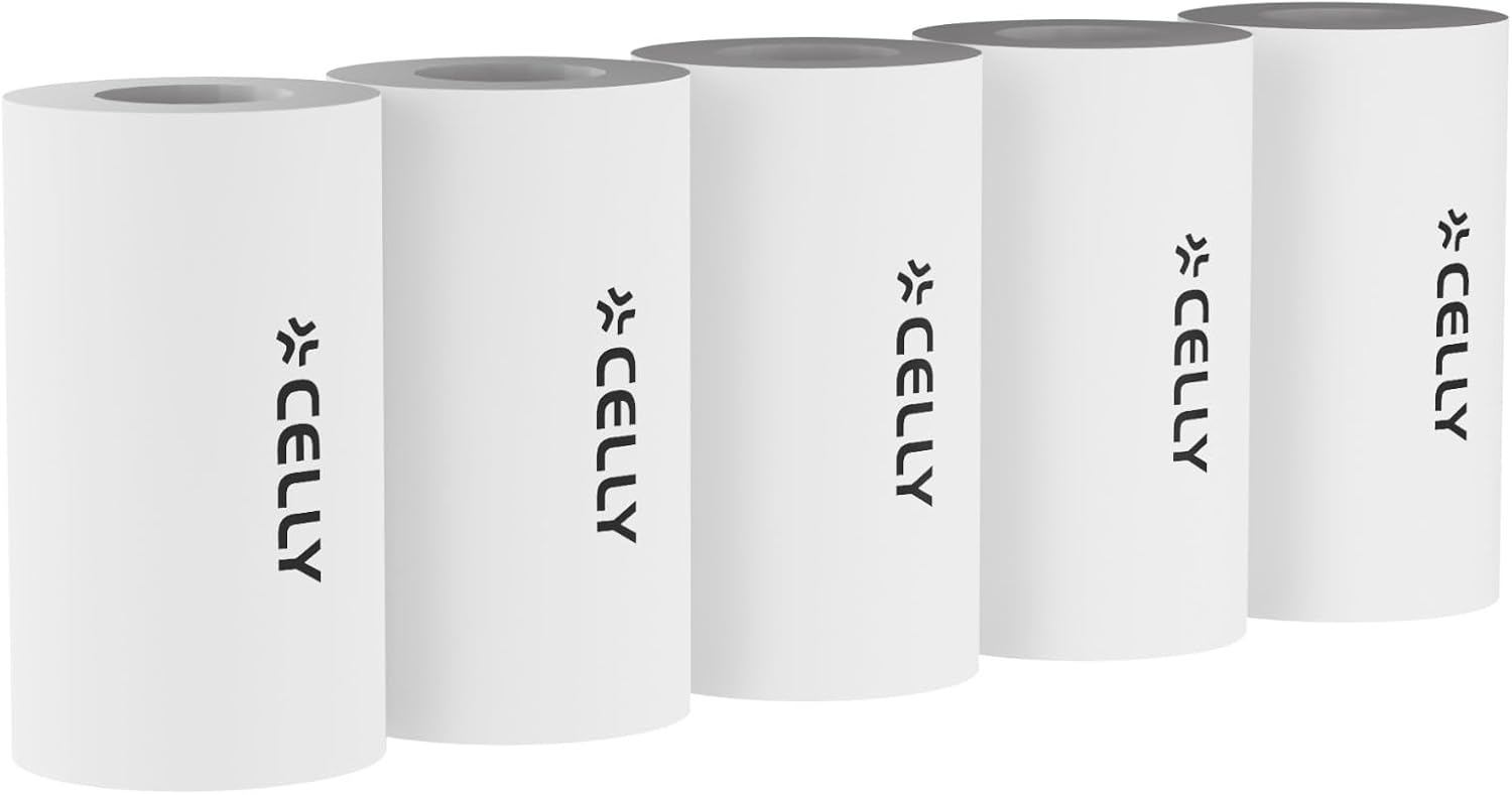 Image 2.1: Celly Thermal Paper Rolls. This image displays five individual rolls of thermal paper, each featuring the Celly brand logo printed vertically on its side. The rolls are white and cylindrical, indicating their purpose for thermal printing devices.